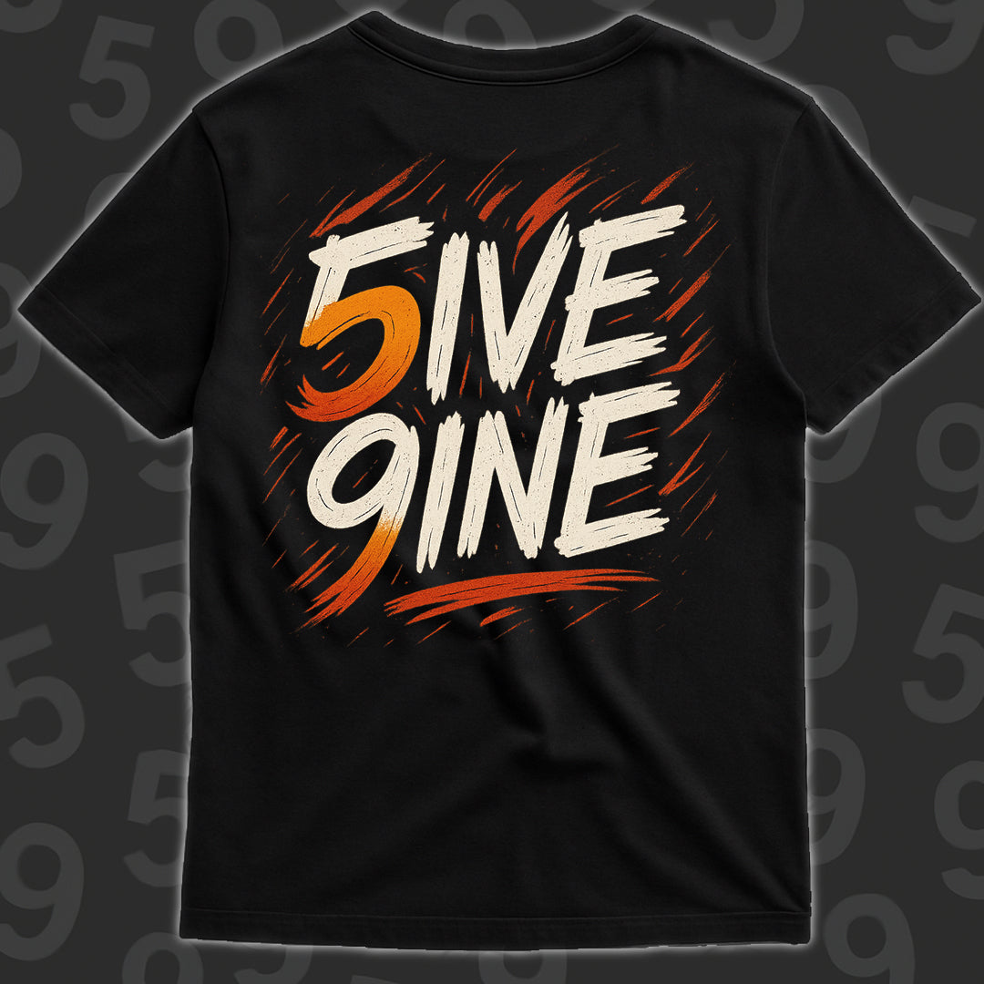 The Desert Glow Mark represents the heart of the 5IVE 9INE brand — warmth, resilience, and the fire that keeps pushing forward. Designed with hand-brushed lettering surrounded by glowing motion strokes, this graphic captures the energy of the desert and the strength that comes from it.